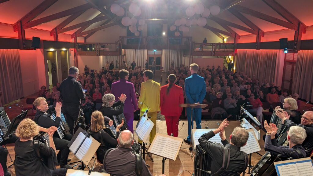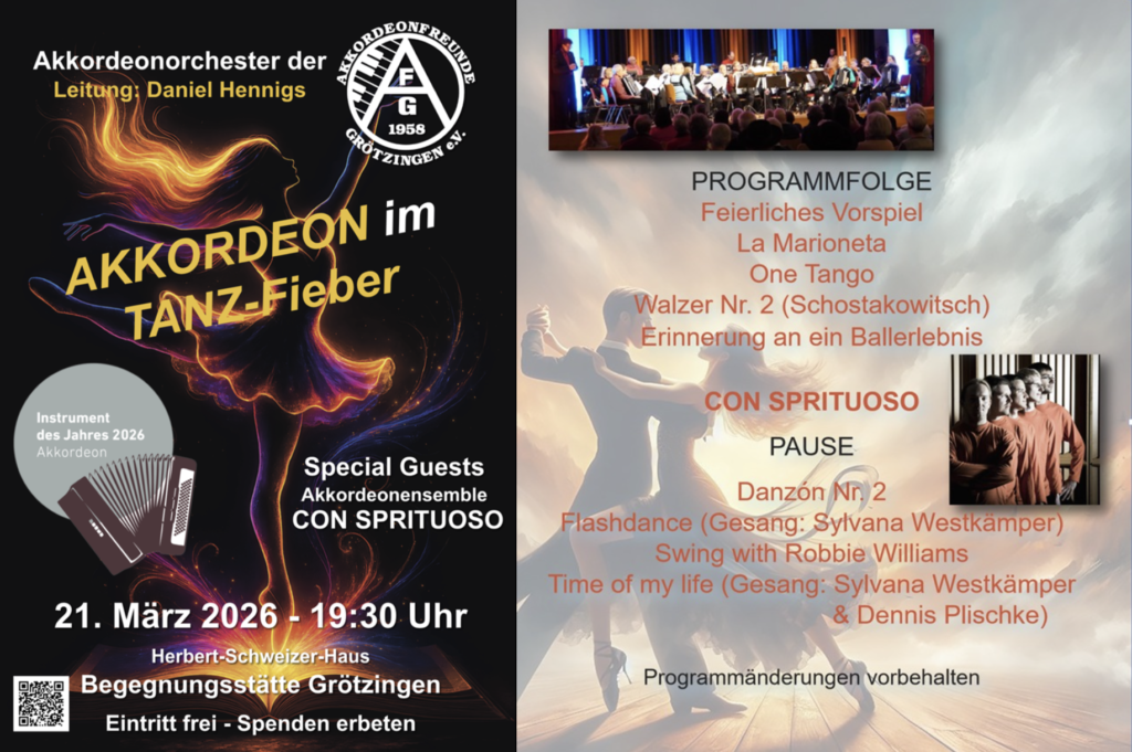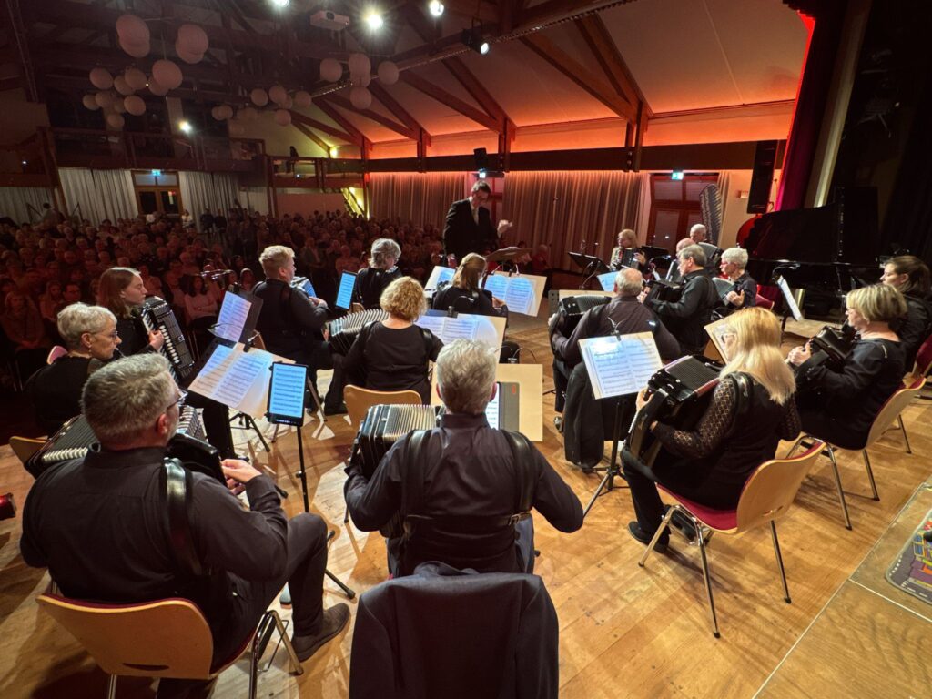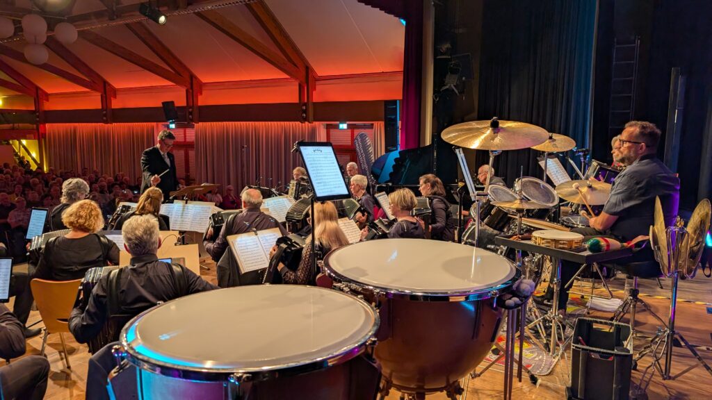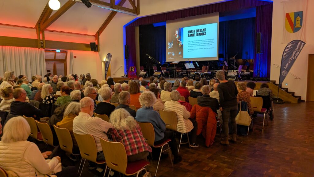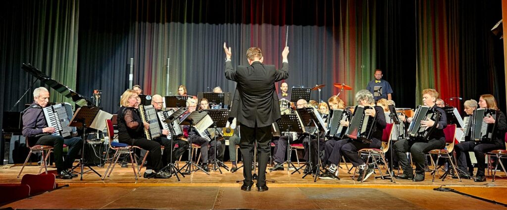 „Feierliches Vorspiel“ entführte die Konzertbesucher aus der Grötzinger Begegnungsstätte geradewegs in das Foyer eines Tanzpalastes und geleitete sie in einen Ballsaal, woraus man bereits spanisches Kolorit vernahm. „La Marioneta“ (F. Haag), die Marionette, tanzte virtuell zu den Rhythmen des Orchesters Tango, spanischen Walzer und eine rasante Feria, bis sie nach dem furiosen Ende an ihren Schnüren in sich zusammensank. Tango und Akkordeon – eine Tradition, mit der man das Instrument des Jahres 2026 spontan in Verbindung bringt. Folgerichtig hatte Dirigent Daniel Hennigs daher auch Ian Watsons 2018 komponierten „One Tango“ in das Konzertprogramm aufgenommen.
