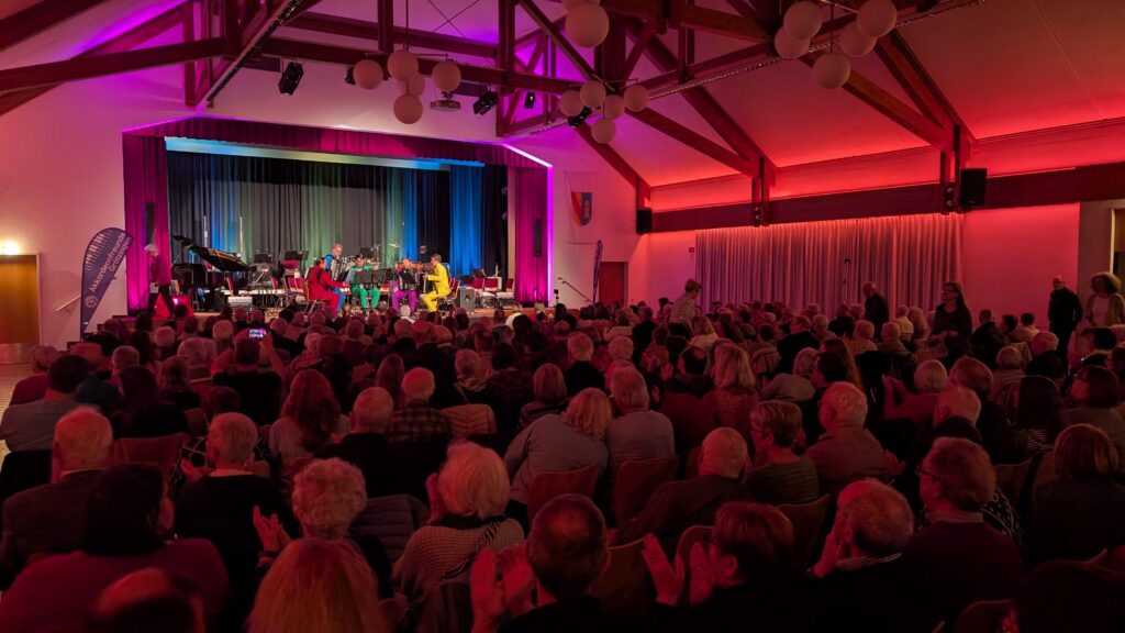 Vorstand Steffen Daubenberger richtete seine Dankesworte an den auch zu später Stunde noch vollbesetzten Saal, das Orchester, den Dirigenten, die Sänger, die Moderatorin – und natürlich an die bunte Truppe des Gastensembles. Das Konzerterlebnis wurde von den Gästen am Ausgang dankbar honoriert und sei es auch mit 1- und 2-Cent-Münzen…